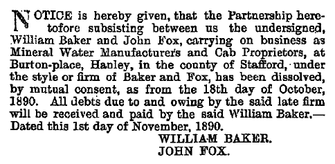 Baker & Fox was a partnership of William Baker and John Fox. They traded from the Excelsior Works, Burton Place, New Street, Hanley, and in addition to being Mineral Water Manufacturers, they were also Cab Proprietors. The pair traded together until the 29th October 1890, after which the partnership was dissolved, as detailed here in an extract from 'The London Gazette, 4 November, 1890' :