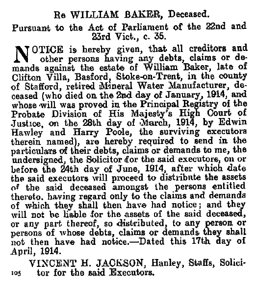 William Baker passed away on 2nd January 1914; the following excerpt from the London Gazette of 21st April 1914 shows a notice to his creditors regarding claims on his estate: